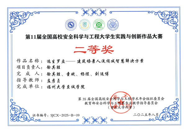 2025年10月19日,第十一届全国高校安全科学与工程大学生实践与创新作品大赛颁奖仪式在重庆圆满举行。我院环境资源工程系学子组建的参赛团队,在庄彦贞老师的悉心指导下,凭借作品《逃生罗盘——建筑场景人流熵减智慧解决方案》一路过关斩将,从全国79所高校的300余件参赛作品中脱颖而出,成功跻身决赛并荣获全国二等奖,为学院与系部赢得了荣誉。